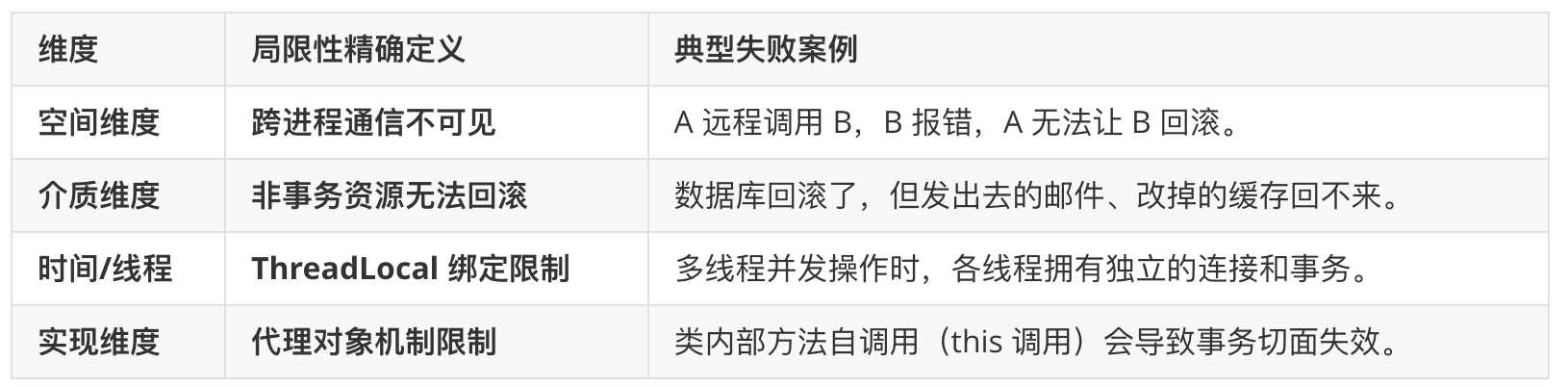 即便是在单体应用中,@Transactional 也有软肋。本地事务默认由 DataSourceTransactionManager 管理,只能管辖同一个数据库连接池中的连接。如果你同时操作 MySQL 和 Oracle,普通的 @Transactional 只能保其中一个。如果你在代码里先发了条 MQ 消息,然后更新 Redis,最后写 MySQL。即便 MySQL 事务回滚了,MQ 消息已经发出了,Redis 里的缓存也已经改了。所以它也无法实现跨物理介质的原子性(除非引入极其厚重的 JTA/XA 二阶段提交协议)。