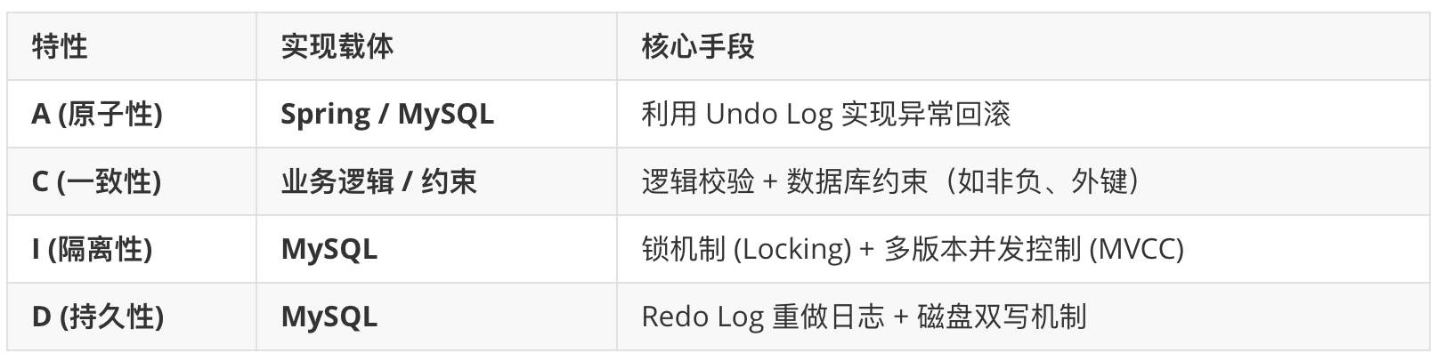 • 底层体现:一旦 transfer 方法执行完毕,Spring 提交了事务,MySQL 会确保数据已经写入了 Redo Log(重做日志) 并刷入磁盘。