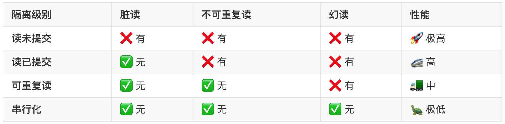 为了平衡性能与安全,SQL 标准定义了 4 种隔离级别。我们可以用 “防偷窥、防干扰” 的程度来通俗理解: