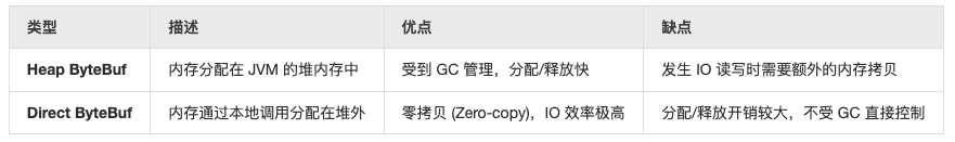 Netty 根据使用场景,提供了两种主要的内存实现: