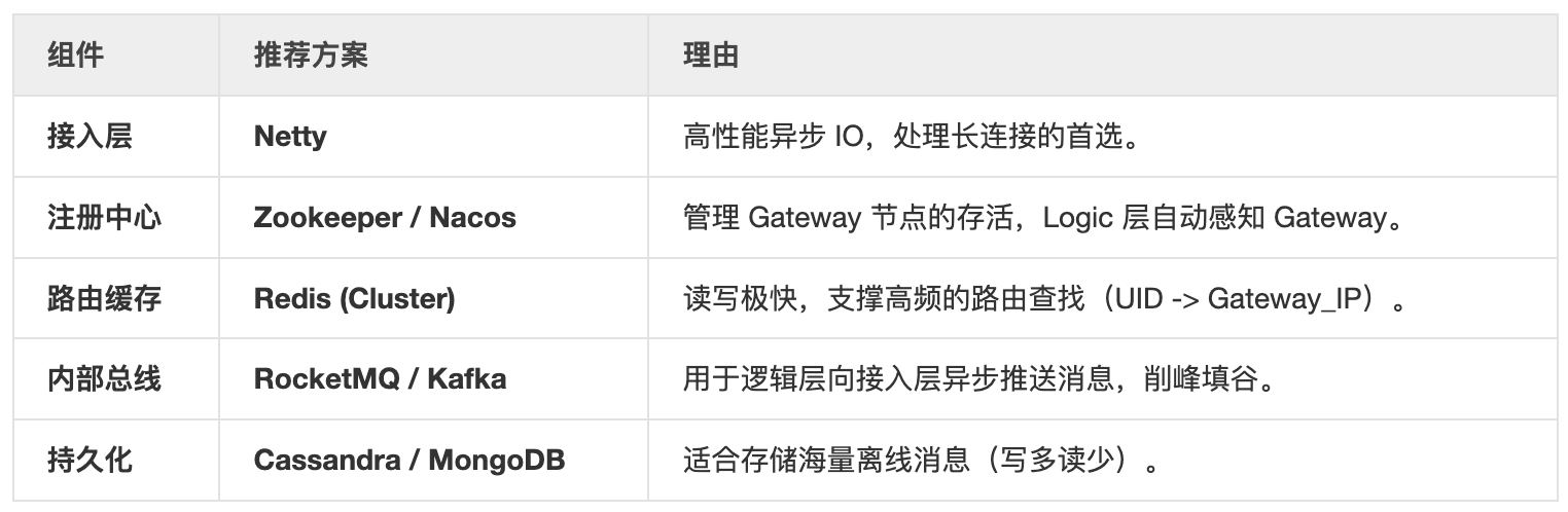 RocketMQ/RabbitMQ:逻辑层将推送指令发给 MQ,各个网关节点订阅自己的队列。网关层和逻辑层异步解耦。