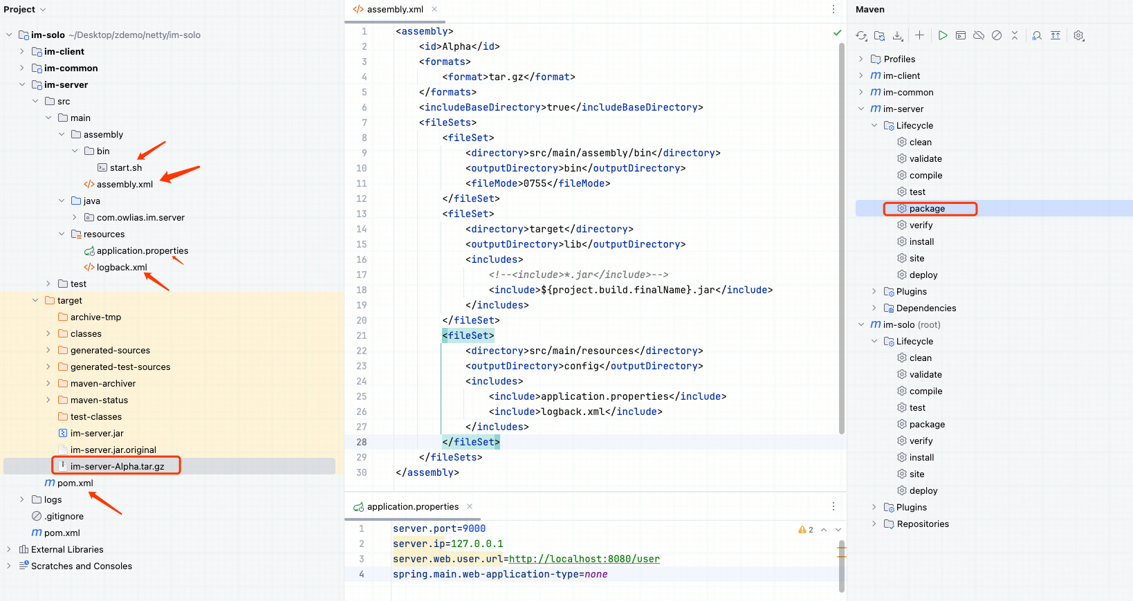 1 2 3 4 5 6 7 8 9 10 11 12 13 14 15 16 17 18 19 20 21 22 23 24 25 26 27 28 29 30 <assembly > <id > Alpha</id > <formats > <format > tar.gz</format > </formats > <includeBaseDirectory > true</includeBaseDirectory > <fileSets > <fileSet > <directory > src/main/assembly/bin</directory > <outputDirectory > bin</outputDirectory > <fileMode > 0755</fileMode > </fileSet > <fileSet > <directory > target</directory > <outputDirectory > lib</outputDirectory > <includes > <include > ${project.build.finalName}.jar</include > </includes > </fileSet > <fileSet > <directory > src/main/resources</directory > <outputDirectory > config</outputDirectory > <includes > <include > application.properties</include > <include > logback.xml</include > </includes > </fileSet > </fileSets > </assembly >