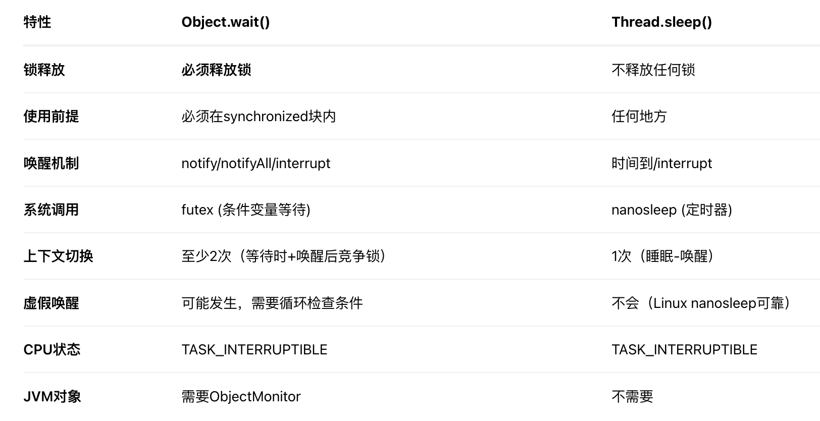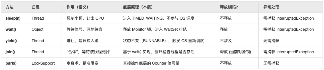 Thread.yield():线程对着 OS 卑微地喊一句:“大哥,我不急,你要是手头有更重要的活儿,先紧着人家。” OS 听完点点头,然后可能反手又把 CPU 分给了这个线程(因为没有更合适的)。Thread.sleep():线程直接躺平:“我睡10毫秒,这段时间别烦我”。 这时OS才会真正把此线程踢出 “就绪队列”。