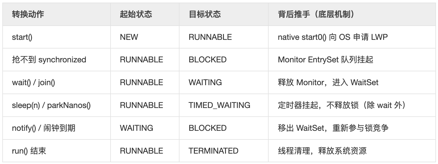 在主流的 HotSpot JVM 中,Java 线程与操作系统线程(内核线程)的关系是 1:1。new Thread() 并 start(),JVM 内部就会通过 C++ 调用操作系统底层的 pthread_create(Linux)或 CreateThread(Windows)。Java 线程的 “真身” 就是一个轻量级进程(LWP)。既然是 1:1,那么谁来决定哪个线程先跑、跑多久?全是操作系统说了算。