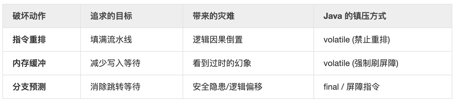 - 在多线程眼里,顺序就是命。比如“先初始化对象,再赋值给变量”,如果被 CPU 优化成“先赋值变量(此时还是半成品),再初始化对象”,另一个线程拿到的就是一个畸形的、不可用的废品。
