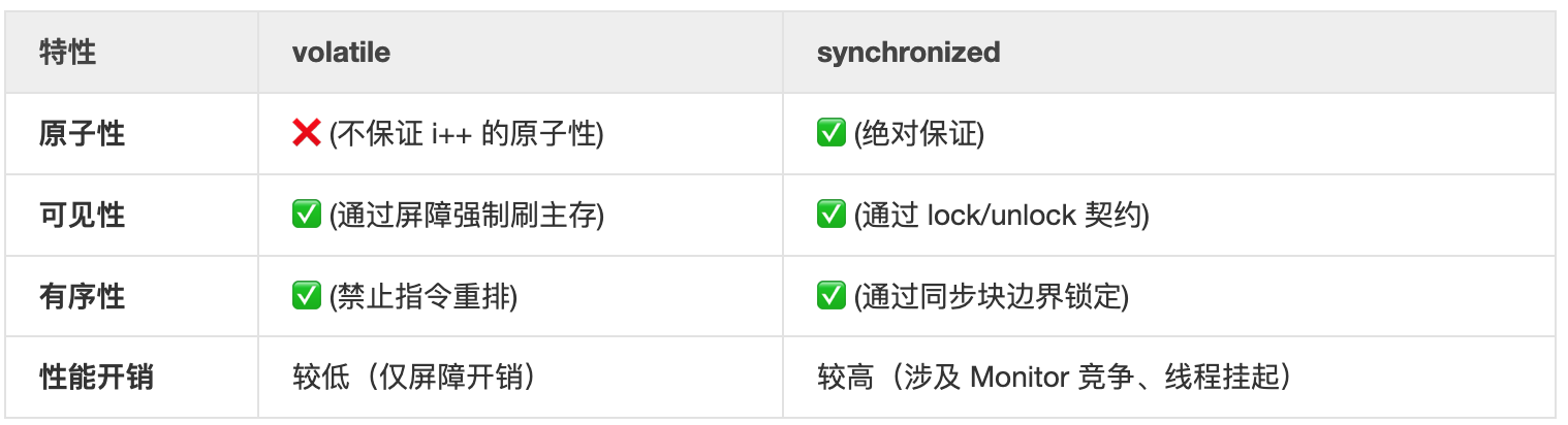 一句话总结:volatile 是通过在代码里插 “隔离带(屏障)” 来实现有序;而 synchronized 是通过 “锁大门(Monitor)” 并规定 “进门带新货、出门留新货” 的规矩来实现同步。