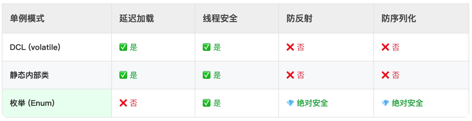 上述两种单例的写法——双重检查锁 和 静态内部类,仍然有一个可以改进的点,那就是它们的单例可能被反射/序列化破坏。我们通常会使用另一种 枚举单例 的方法来解决这个问题,枚举单例也被《Effective Java》作者 Joshua Bloch 称为实现 Singleton 的最佳方法,它的 “硬核” 不在于代码多复杂,而在于它直接在 JVM 运行规范和 Java 编译指令两个维度上封死了所有退路。