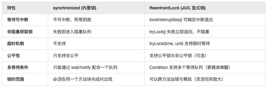 虽然 synchronized 简单好用,但 JUC 提供的 Lock 接口在功能上是降维打击,它解决了 synchronized 无法处理的三个痛点: