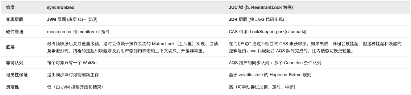 • JVM 深度优化:JVM 可以感知 synchronized 的状态。例如,如果 JVM 发现一个锁对象只被一个线程访问,它会直接通过锁消除来提升性能,而 JUC 类库很难被这种编译器级别的优化覆盖。
