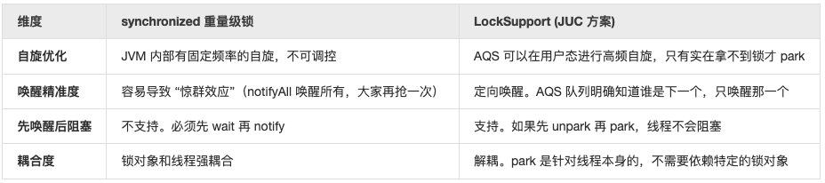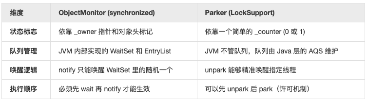 synchronized 是为了 “好用” 和 “稳定”: 它把复杂的并发控制封装在 JVM 内部,给普通开发者提供一个简单、安全、几乎不会出错的同步手段。它是 Java 的基础设施。LockSupport 是为了 “强大” 和 “灵活”: 它是给 JDK 大牛(如 Doug Lea)用来构建 AQS、线程池等高级工具的。它不需要像管程那样绑定在某个对象上,它直接操作线程,提供了极致的灵活性。