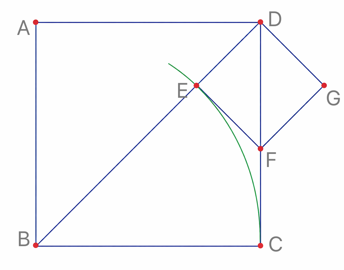 假设正方形ABCD的边长为1,正方形的对角线BD,能否用边长BC度量呢?也就是说 (BD, BC) 存不存在呢?把BD减去BC,剩下一段DE。以DE为边做一个新的小正方形DEFG,那么显然DE=EF=FC。接下来应该在BC和DE间辗转相除,BC就等于CD,CD减去一个DE相当于减去一个FC,就只剩下一段DF了。现在轮到DE和DF之间辗转相除,而它们是一个新的正方形的边和对角线,其比例正好与最初的BC和BD相当。于是,这个操作再次回到原问题,并且无限递归下去。这个过程无穷无尽,于是希帕索斯得出 正方形的对角线与边长不可公度(即斜边长度无法表示为边长的整数比) 的结论。希帕索斯通过几何的 无限递降法(Antiphairesis)揭示了有理数体系的局限性,为无理数的发现奠定了基础,这种方法后来发展成现代的连分数理论。
