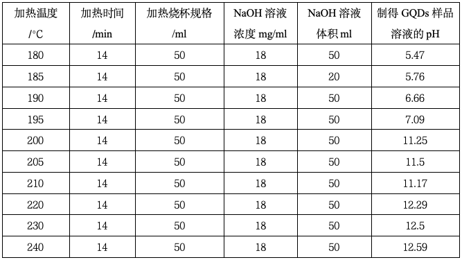 为寻求制备GQDs的最佳的反应温度,我们采用控制变量法探究了不同反应温度对GQDs制备的影响,具体参数设定和结果见表2.1。