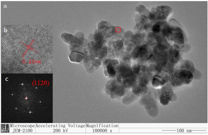 图3.2为200℃恒温条件下制备的GQDs的TEM图像及其傅里叶变换图。图3.2(a)反映200℃恒温条件下制备的GQDs的整体分散性也相对较好,但与195℃恒温条件下制得的GQDs相比,其尺寸大小不均,自组装后局部形状不规则。图3.2(b)显示的是图3.2(a)的单个石墨烯量子点的放大图,在图3.2(b)中可清晰地看到单个石墨烯量子点的晶体结构,说明200℃恒温条件下制备的GQDs的结晶度也非常好,图3.2(b)显示的单个石墨烯量子点的直径约为3.6 nm,(1120)面间距约为0.23 nm,与图3.2(c)中GQDs的傅里叶变换(1120)面间距相一致[13]。