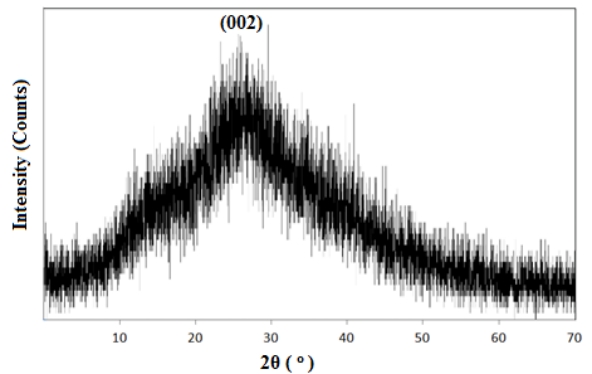 图3.4是GQDs在195 ℃恒温条件下制得的GQDs样品的XRD图。从此图可以看出,GQDs在 ${2 \sin \theta}$ = 26.40° 的位置处有一个明显的宽衍射峰,略大于块状石墨的(002)面间距,其原因可能是加热制备的GQDs含有—COOH、—OH等官能团。根据布拉格公式(所用X射线衍射波长为0.15406 nm)可算出 $d_{(002)}$ 为 0.3373 nm,这与文献 [20,21] 所述基本一致。根据Fanklin模型,由Mering和Marie简化公式(3.2.2):