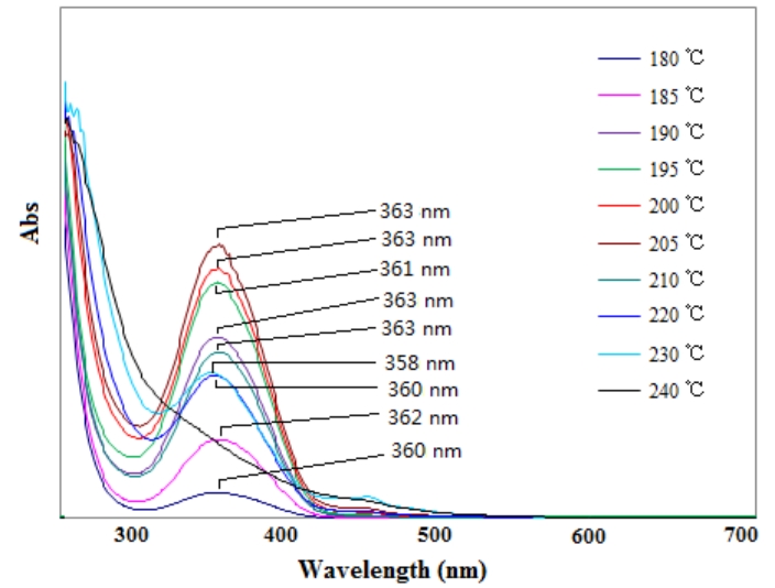 图3.5是用柠檬酸在不同的恒温条件下制备的GQDs水溶液的吸收光谱。由图3.5可以看出,GQDs在紫外区域有很强的吸收,吸收峰位在360 nm处左右,不同的加热温度制得的样品略有差异。吸收峰的产生与 C=O 的 $n \rightarrow \pi^*$ 跃迁有关[22]。加热温度在180 ℃到230 ℃之间,吸收峰比较明显;加热温度达到和超过240 ℃以后,不再有明显的吸收峰。