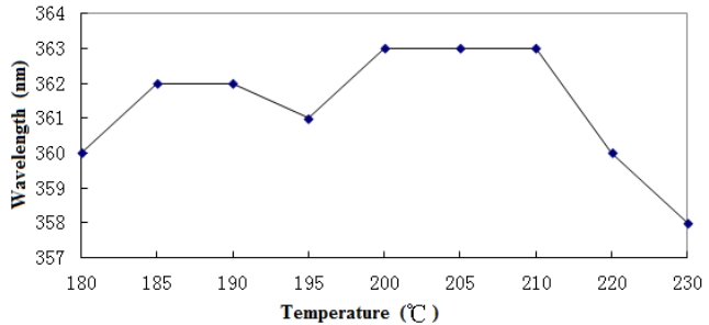 图3.6 GQDs样品溶液吸收峰位随加热温度变化曲线