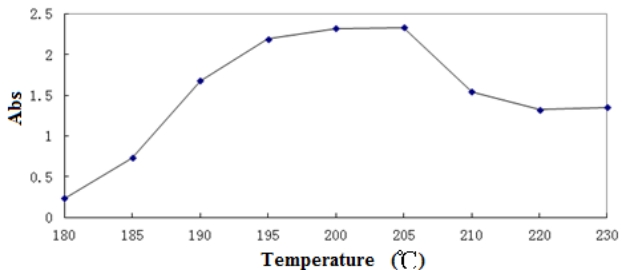 下面通过GQDs的吸收谱讨论不同的加热温度对GQDs样品的影响。如图3.6是GQDs样品溶液吸收峰位随加热温度变化曲线,可以看出不同反应温度下得到的GQDs样品溶液的吸收峰略有差异,主要集中在紫外区的362 nm和363 nm处。当加热温度高于210℃时,随着加热温度的升高,吸收峰发生蓝移,其原因可能是随着温度的升高而使得溶液中的富氧基团增加。图3.7是GQDs样品溶液吸收峰相对强度随加热温度变化曲线,吸收峰的相对强度可以说明GQDs样品溶液浓度的相对大小。相比之下,吸收峰越强则说明该样品的GQDs浓度越高,产率也就越大。从图3.7可以看出温度在200℃左右,所得GQDs样品溶液的吸收峰相对强度最大。综合图3.7以及上述TEM分析可得出最佳的加热温度为200℃左右(195℃~200℃)。