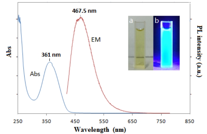 光谱右侧的插图分别是紫外光激发前(a)后 (b)GQDs样品溶液的颜色