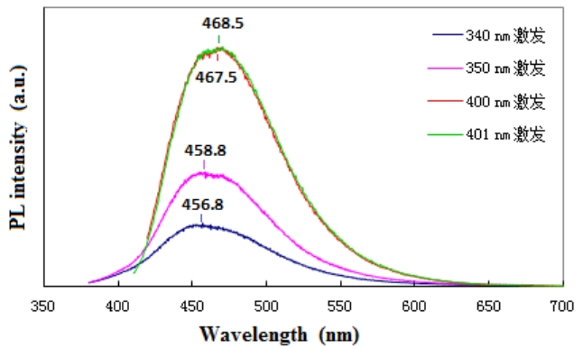 图3.9是柠檬酸在195℃恒温14 min制得的GQDs样品分别用340 nm、350 nm、400 nm和401 nm波长的紫外光激发得到的荧光谱。图中显示,在340 nm到401 nm的波长范围内,GQDs样品的荧光发射谱峰位将会随着激发波长的增大而发生一定的红移,表现出激发依赖的光致发光行为[23]。其光致发光的强度将会越来越大,并且其发射的荧光波长范围集中在绿光波长区域。