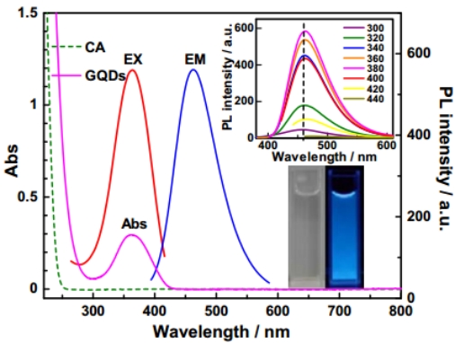 图1.2 GQDs的紫外-可见吸收光谱和光致发光谱[20]