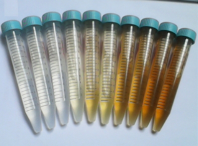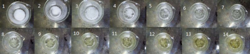 图2.2是柠檬酸在195 ℃恒温加热条件下热分解法制备GQDs的过程中随着加热时间的延长,被加热的柠檬酸颜色由白色逐渐变成黄色渐变过程。