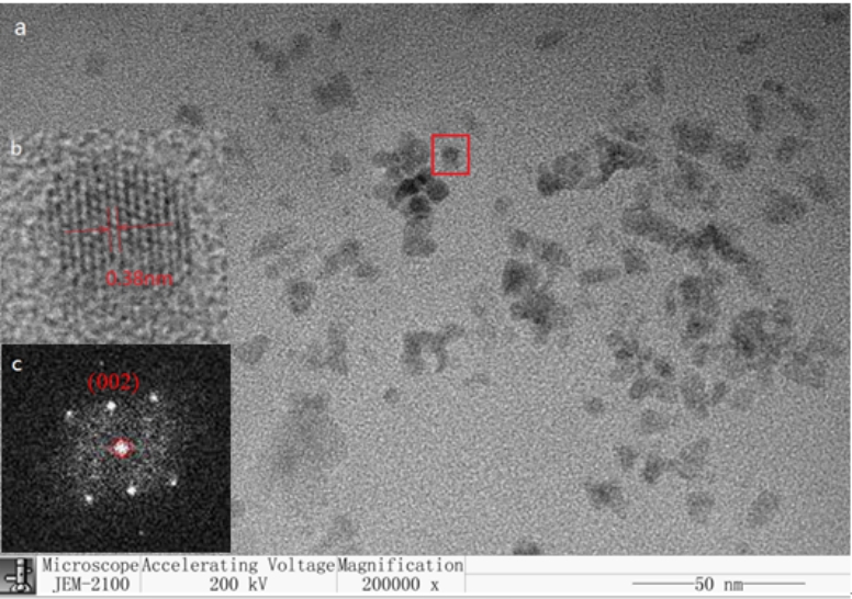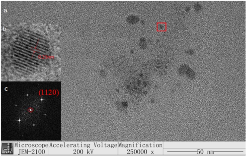 图3.2 200℃恒温条件下制得的GQDs样品的TEM图像(a b)及其傅里叶变换图(c)