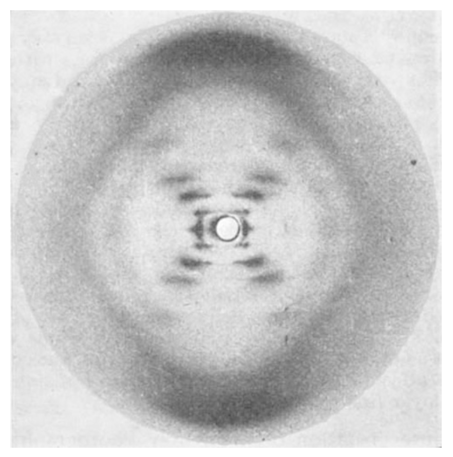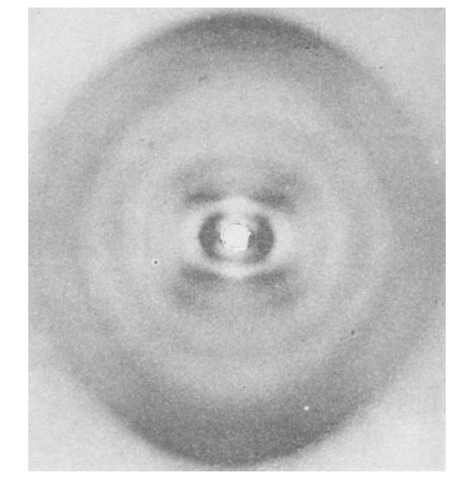 图 1. 胸腺嘧啶核酸钠的纤维 X 射线衍射图谱,结构 B(这就是科学史上著名的 Photo 51,它直接证明了 DNA 的螺旋结构)如果我们采用螺旋结构的假设,立刻就能从结构 B 的 X 射线图中对螺旋的性质和尺寸做出某些推论 。在第一、第二、第三和第五层线上,最内侧的极大值点近似位于从原点辐射出的直线上 。对于平滑的单股螺旋,第 $n$ 层线上的结构因子由下式给出: