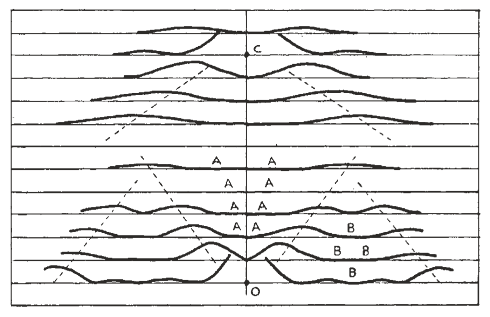 图 2. 对应于脱氧戊糖核酸结构的螺旋系统的衍射模式。图中在赤道线以及第一、第二、第三和第五层线上,围绕原点 O 绘制了贝塞尔函数(Bessel functions)的平方。计算假设一半的核苷酸质量分布在 20 Å 直径处,其余部分沿半径分布,且给定半径处的质量与该半径成正比。在第十层线的 C 点附近,针对 12 Å 的外径绘制了类似的函数。必须首先确定该结构主要由一个螺旋组成(层线强度分布对应 $J_1, J_2, J_3…$),还是由两个相似且同轴、尺寸为上述两倍且沿轴向错开半个螺距的螺旋组成(给出 $J_2, J_4…$),或是三个螺旋等 。通过检查层线条纹的宽度,发现强度更接近于 $J_1^2, J_2^2, J_3^2$ 。因此,主螺旋的螺距约为 34 Å,根据螺旋角度计算,其直径约为 20 Å 。